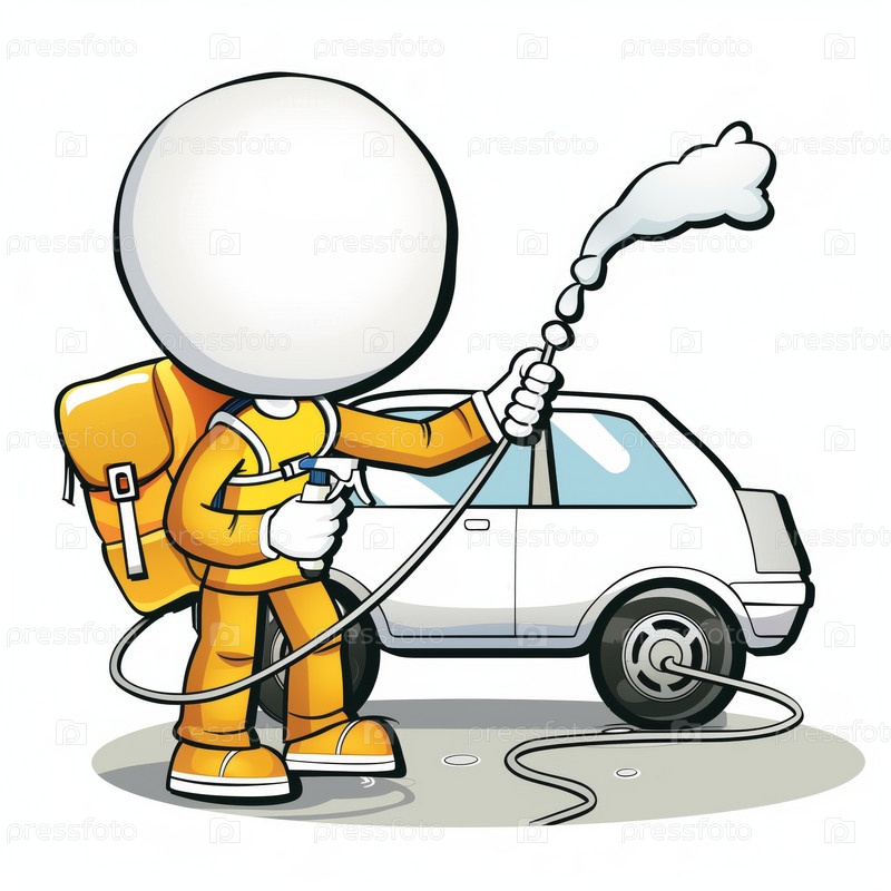 Стикмен моет машину из шланга, изолированный на белом фоне