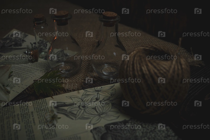 Мистический натюрморт в винтажном стиле с пустыми колбами, горящими свечами, письмами и газетными вырезками