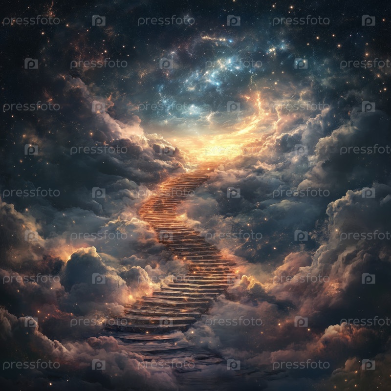 Лестница, ведущая сквозь облака к сияющему свету в небе. Путь на небеса