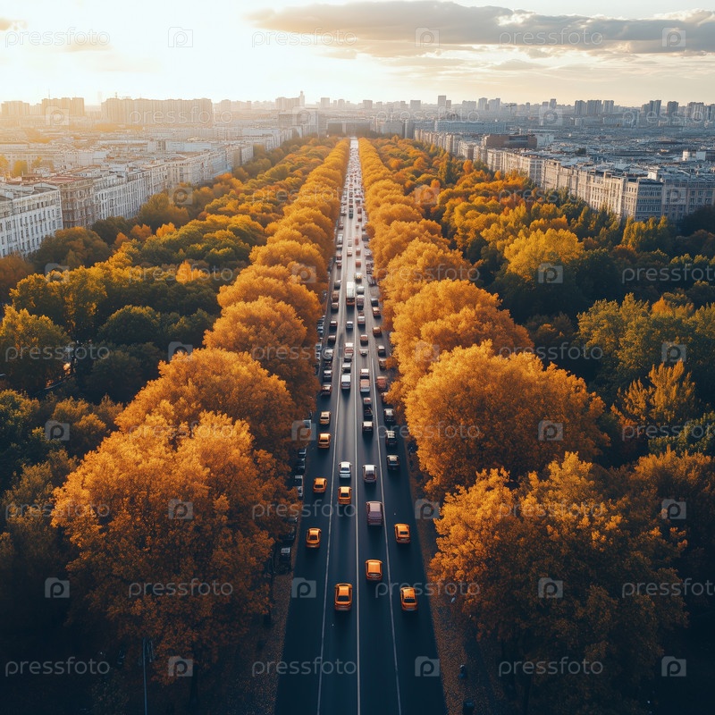Вид с воздуха на оживленную дорогу, окруженную осенними деревьями на закате