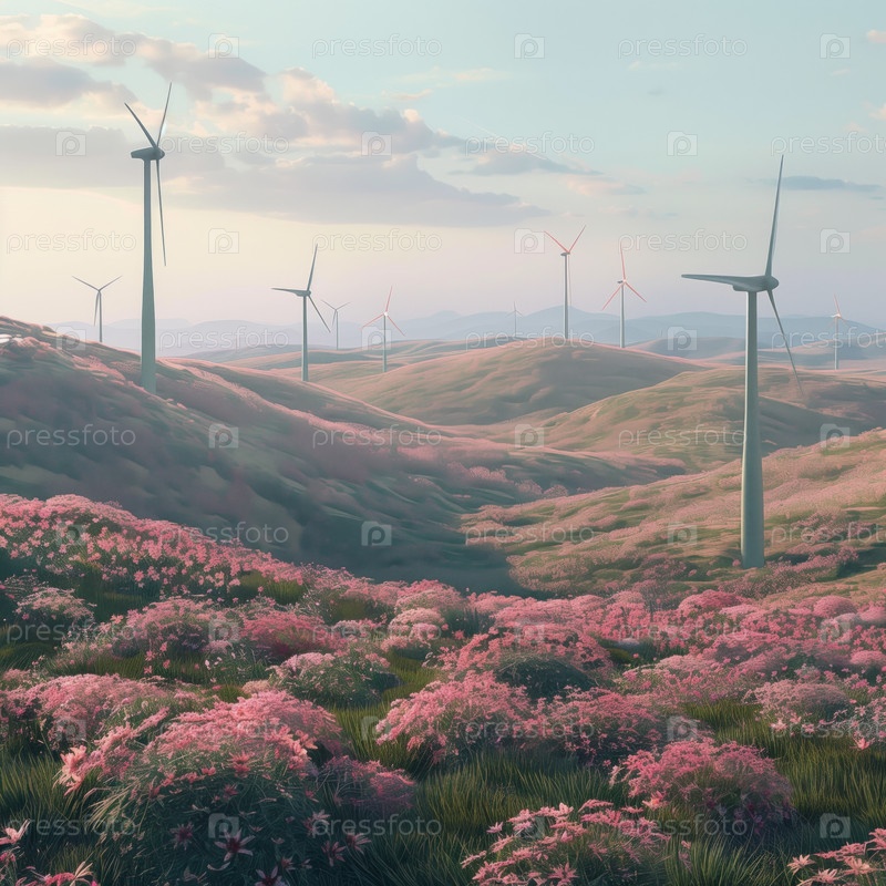 Ветряные турбины на холме с полевыми цветами