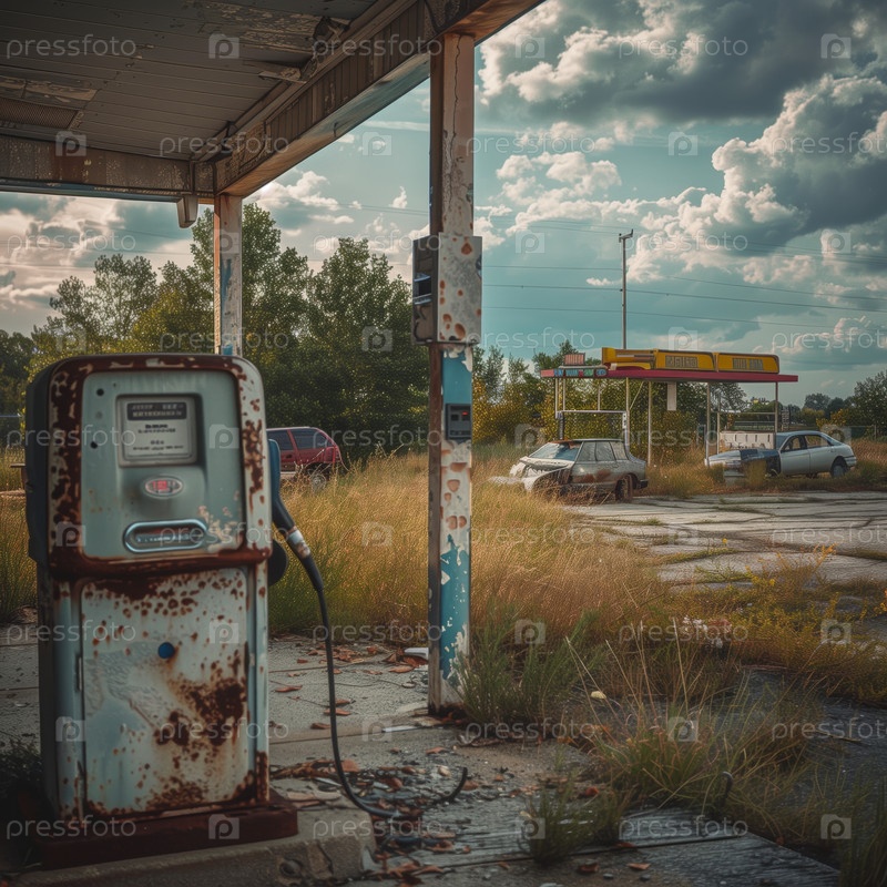 Заброшенная сельская автозаправочная станция со старыми автомобилями и заросшей растительностью
