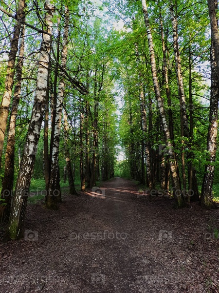 Лесная тропа вдоль ряда деревьев. Солнце светит и лучи проникают сквозь деревья