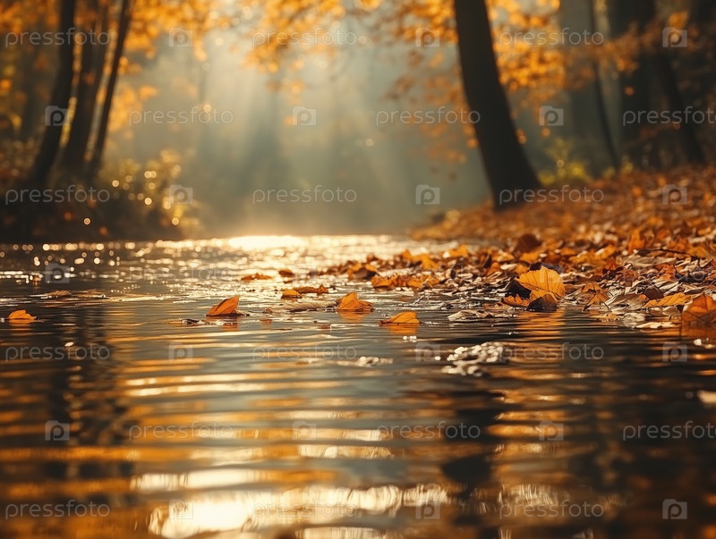 Мирный осенний лес с золотыми листьями у ручья