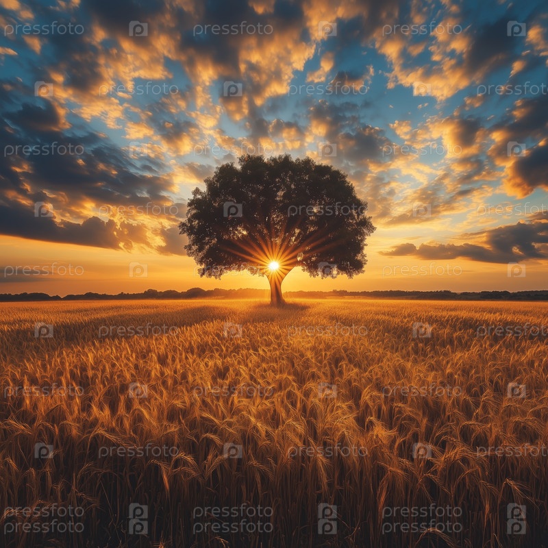 Дерево на золотом пшеничном поле на закате