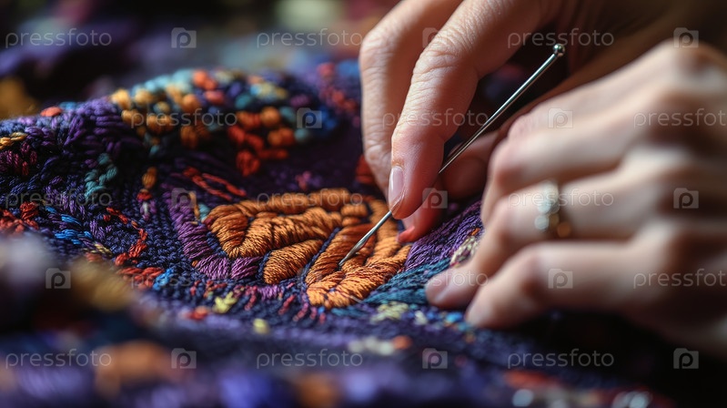 На этом изображении запечатлено тонкое искусство ручного творчества с использованием ярких ниток и инструментов, идеально подходящее для иллюстрации креативности и мастерства в любом дизайнерском проекте