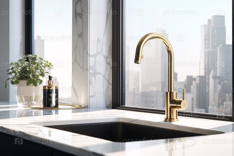 Водопроводный кран, крупным планом. Текущая вода в раковине ванной комнаты. Современный чистый дом, мытье рук и концепция гигиены