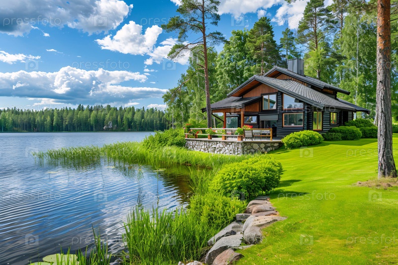 Элегантный современный дом на берегу озера с большими стеклянными стенами и пирсом