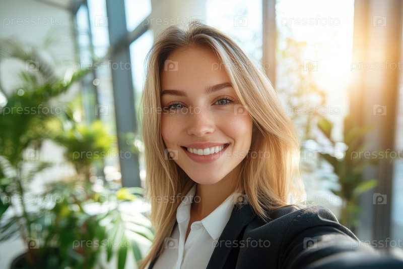 Профессиональное селфи в современном зеленом офисе с солнечным светом и растениями
