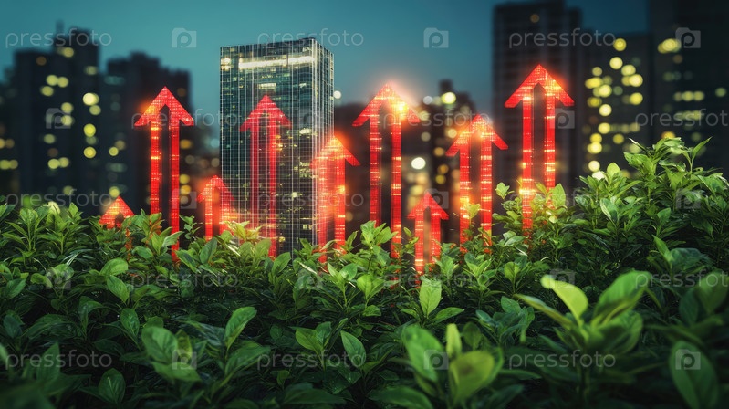 На изображении изображен яркий рост растений под неоновыми стрелками, символизирующий прогресс в области городских экологически чистых инноваций