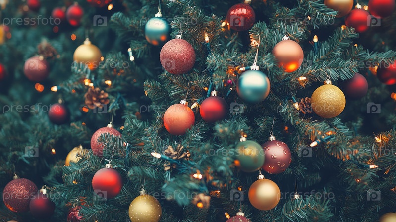 Красиво украшенная рождественская елка с разноцветными игрушками и падающими снежинками создает праздничное и радостное предпраздничное настроение