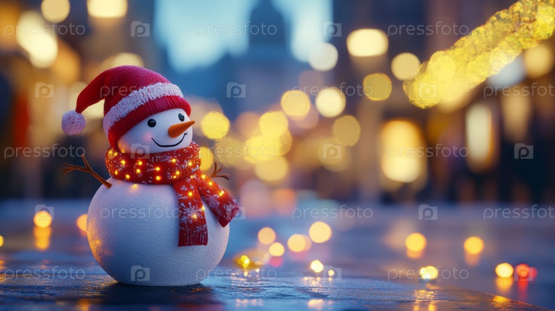 Праздничный снеговик в огнях ночного города