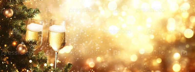Праздничное изображение двух бокалов шампанского рядом с украшенной рождественской елкой, вызывающее радость и тепло в преддверии Нового года