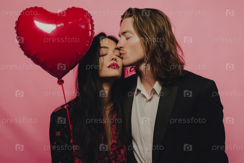 Романтическая пара с воздушным шаром в форме сердца на розовом фоне