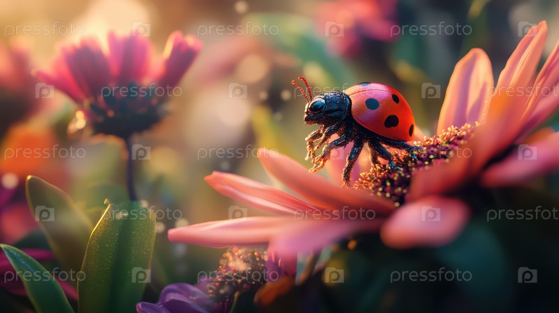 Божья коровка на цветущем цветке в золотом свете