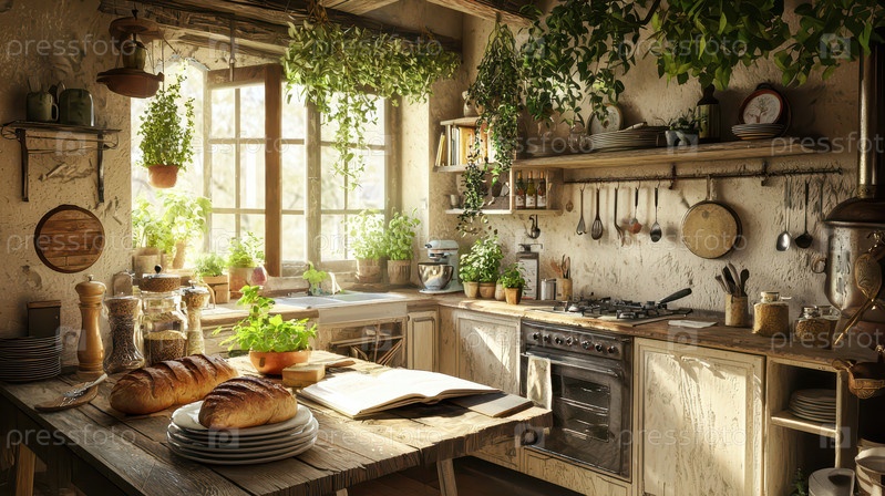 Уютная деревенская кухня со свежеиспеченным хлебом