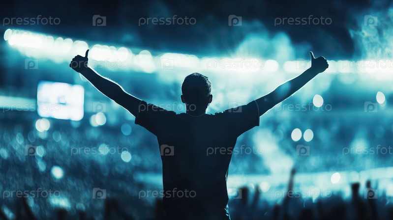 Футбольный болельщик празднует победу, подняв большой палец вверх