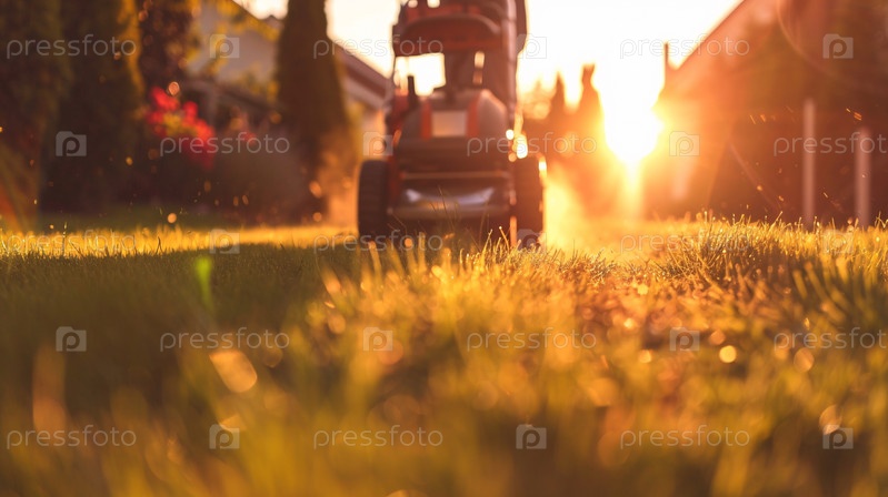 Крупный план газонокосилки, стригущей траву в солнечный день