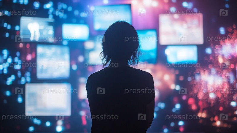 Силуэт женщины, смотрящей на цифровые экраны