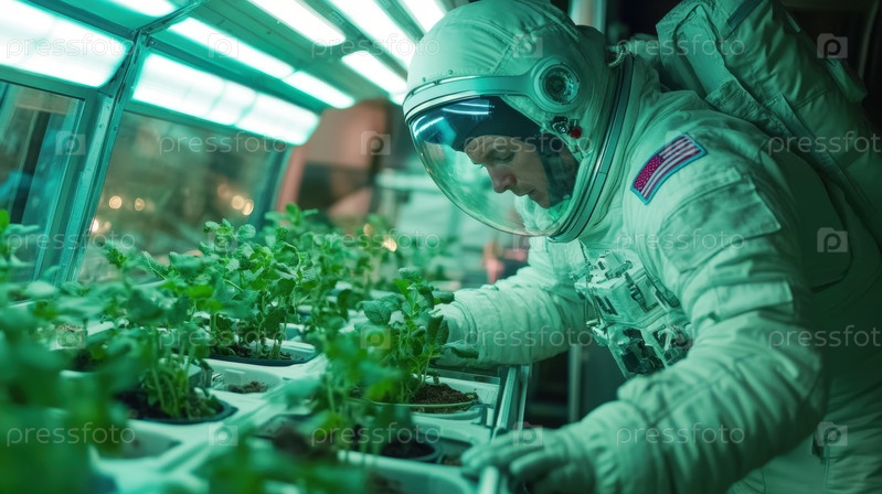 Астронавт ухаживает за тепличными растениями в условиях космоса