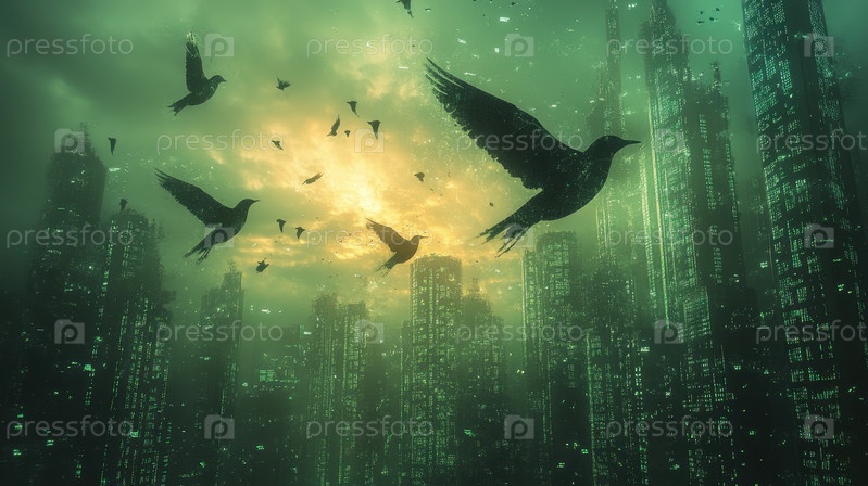 Цифровой силуэт птицы, летящей сквозь зеленую кибернетическую матрицу со светящимися частицами, символизирующими искусственный интеллект и поток данных