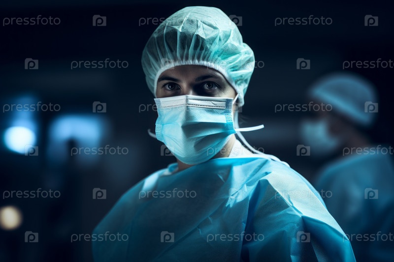 Врач в хирургической маске и перчатках выглядит сосредоточенным и готовым оказать медицинскую помощь