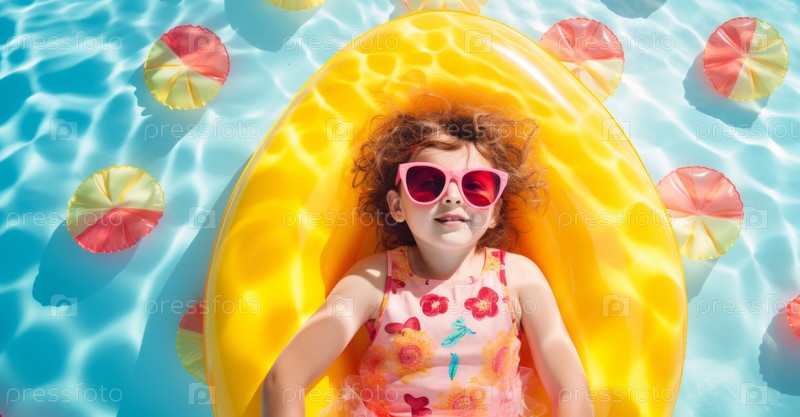 Маленькая девочка в солнцезащитных очках отдыхает на красочном надувном круге в бассейне летним днем