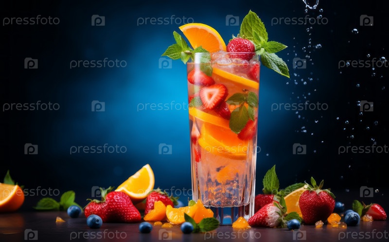 Освежающий разноцветный фруктовый коктейль со льдом, лимоном и мятой в баре, вечеринка в ночном клубе с прохладительными напитками