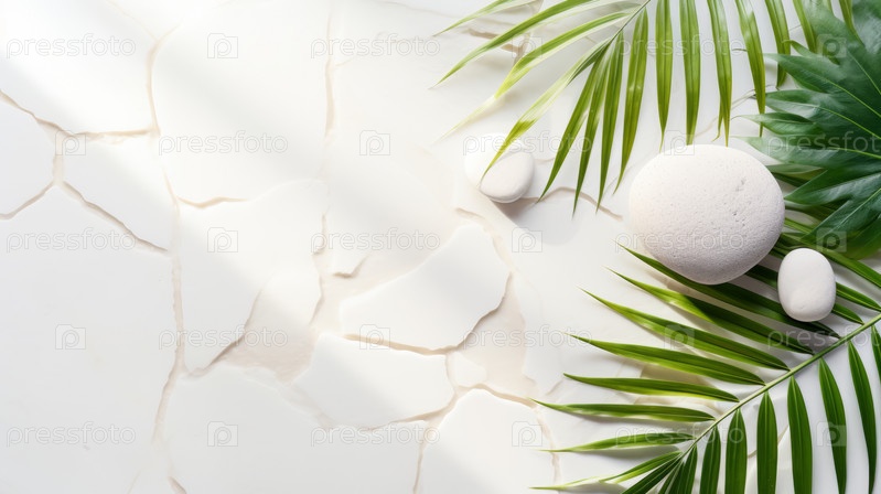 Вид сверху на натуральные белые камни и пальмовые листья на белом фоне. Спа-фон, вид сверху. Тропический летний фон для роскошного размещения продукта