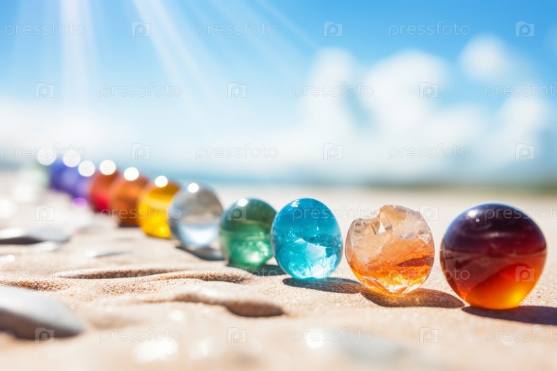 Яркие, красочные стеклянные драгоценные камни сверкают на солнце на песчаном пляже с видом на океан