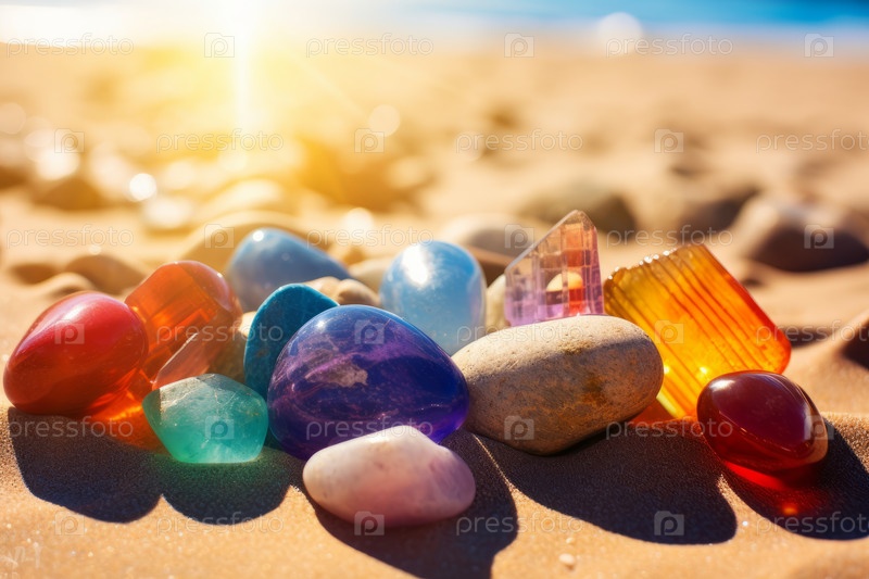 Яркие, красочные стеклянные драгоценные камни сверкают на солнце на песчаном пляже с видом на океан