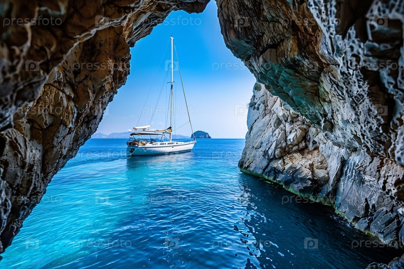 Роскошная яхта, проходящая через Голубую пещеру в живописном месте отдыха на море