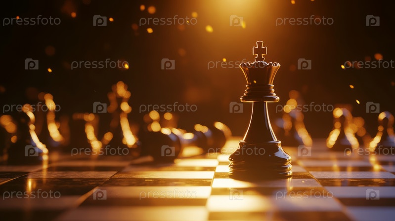 Шахматный король величественно возвышается среди тлеющих углей, символизируя стратегию и победу