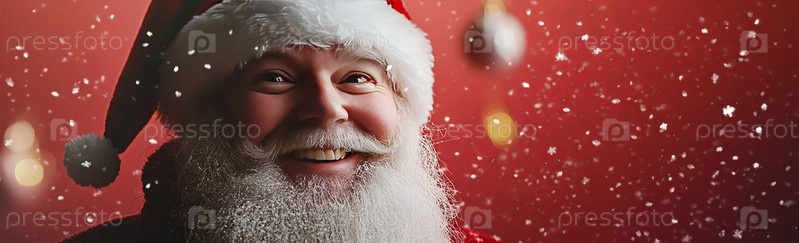 Санта в красном стоит на заснеженном фоне, держа в руках веселые праздничные игрушки