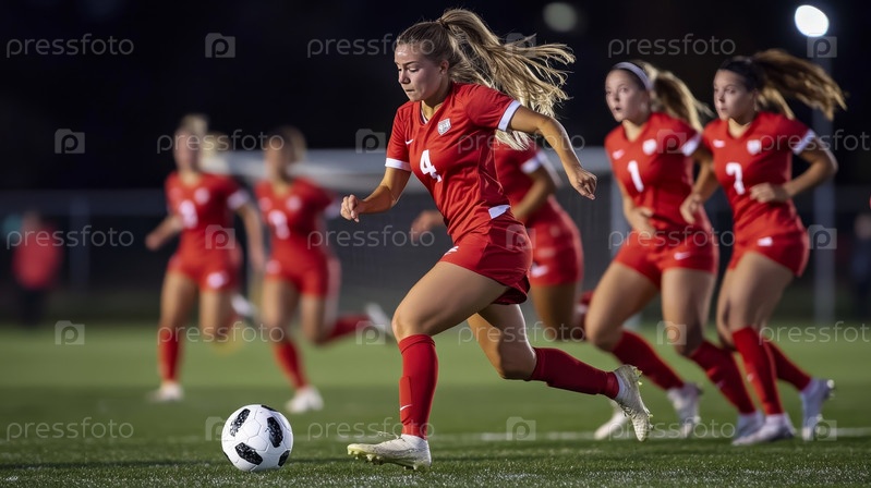 Футболистки в красной форме энергично соревнуются на ярко-зеленом поле