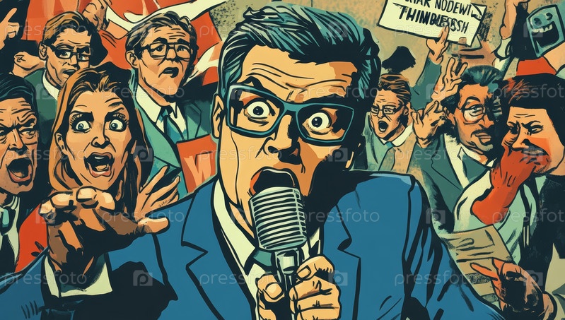 Эта яркая иллюстрация передает динамическую энергию политического митинга, фокусируясь на заинтересованном ораторе и восторженной толпе