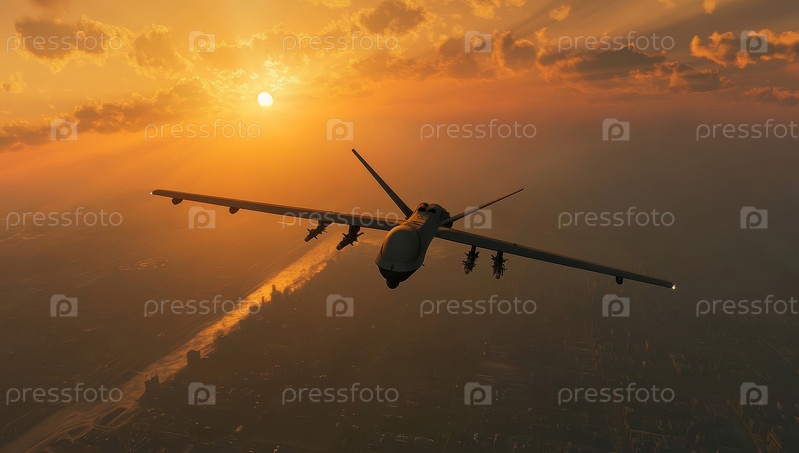 Динамичное изображение, на котором запечатлен элегантный дрон, летящий на фоне яркого заката, демонстрирующее передовые технологии и авиацию в захватывающей сцене
