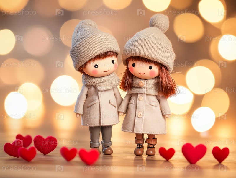 Очаровательная парочка кукол в уютных зимних нарядах в окружении сердец
