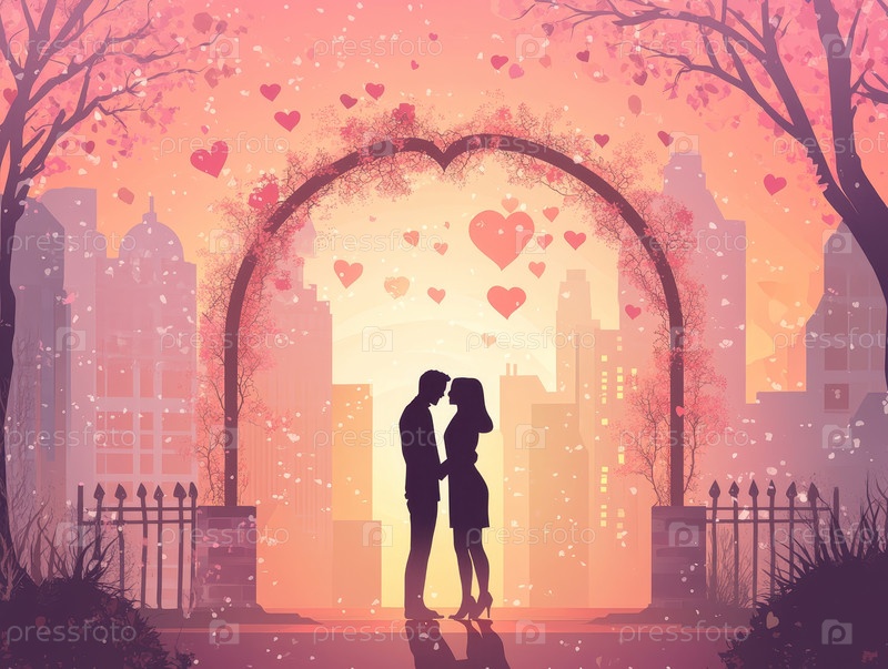 Силуэт пары под аркой в форме сердца на фоне городского пейзажа на закате создает романтическую и мечтательную атмосферу, идеально подходящую для празднования любви