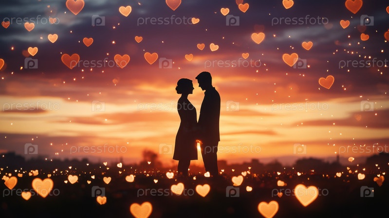 Вдохновляющие эмоции и нежные чувства запечатлены на этом захватывающем снимке пары, целующейся под закатным небом, усыпанным сердечками
