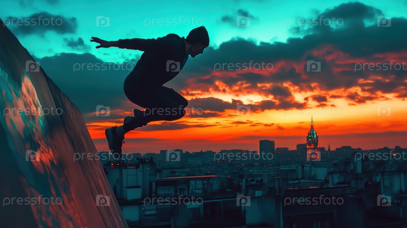 Городской паркур: динамичный прыжок на фоне закатного горизонта города