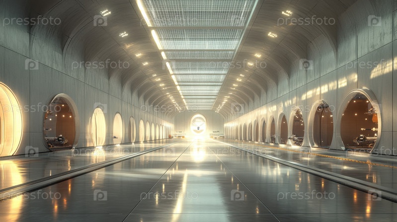 Современный футуристический бетонный коридор с круглыми окнами, отражающими свет и создающими ощущение глубины и перспективы