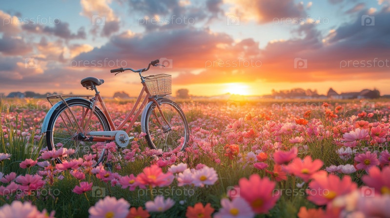 Безмятежный велосипед в море цветущих цветов на закате