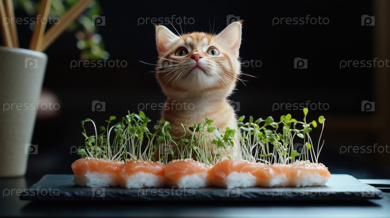 Любопытный рыжий кот смотрит на тарелку свежих суши из лосося с микрозеленью, создавая игривую и аппетитную сцену