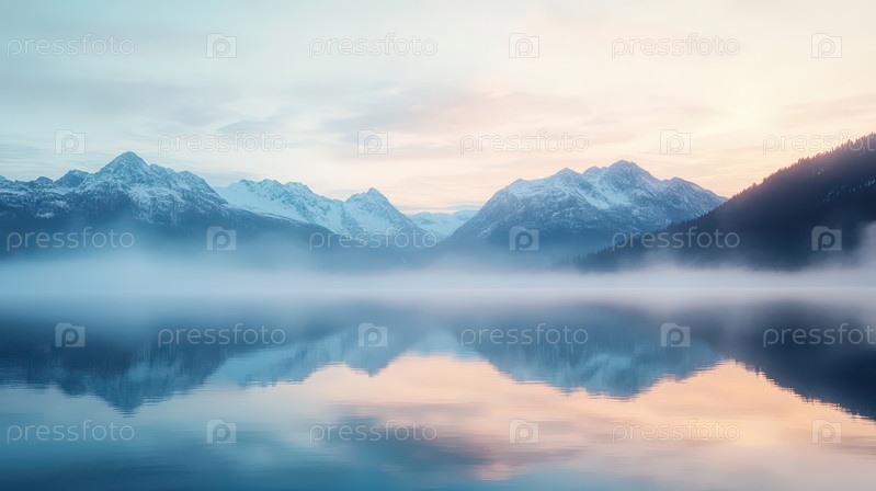 Спокойное горное озеро с туманным отражением на рассвете