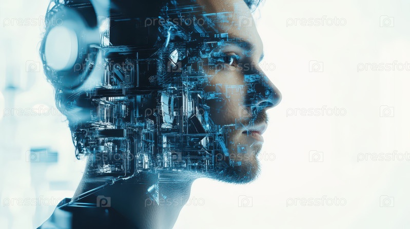 Футуристическая двойная экспозиция, демонстрирующая профиль инженера на фоне сложных промышленных трубопроводов и конструкций, символизирующих технологии, промышленность и инновации