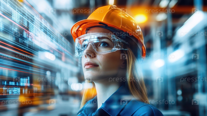 Работница в промышленной среде с цифровым интерфейсом