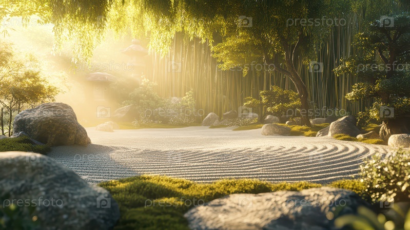 Тихий дзен-сад с камнями и бамбуковыми деревьями