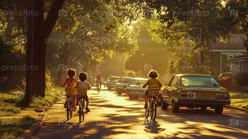 Дети катаются на велосипедах летним днем на тихой улице