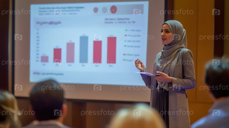 Мусульманская бизнес-леди проводит презентацию с графиками